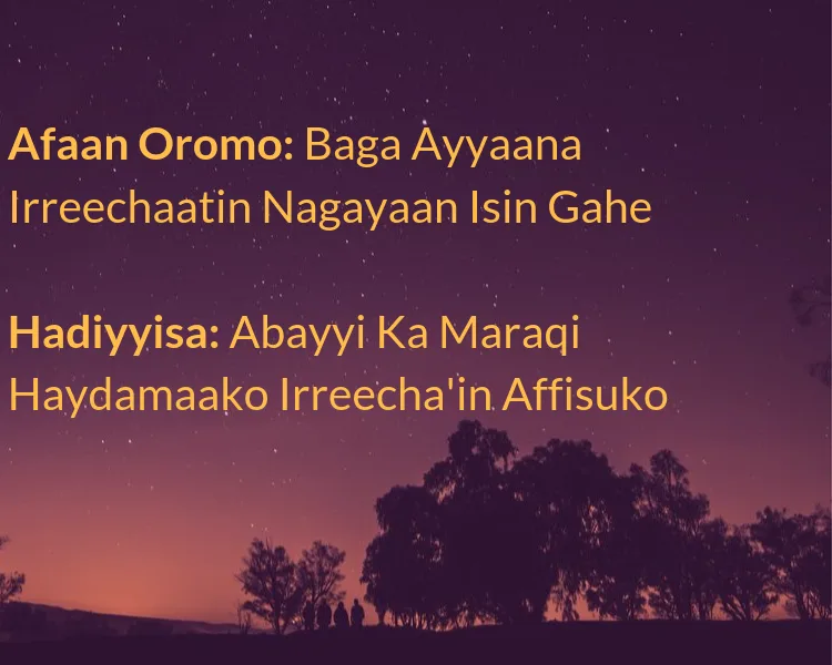 We estimate that the Hadiya’s Fandaanano, the traditional socio-religious system shares over 90% of its features with Waaqeffanna of the Oromo. Irreechaa is a part of Waaqeffanna socio-religious system and the overall Oromo culture.